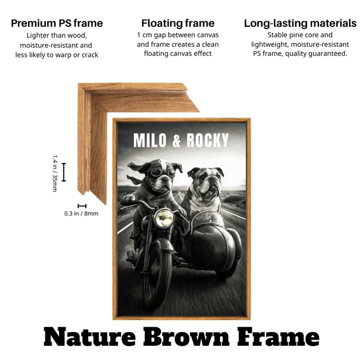 A: You send your photo, we design a custom motorcycle scene with your dog as the rider, then print it on canvas and mount it.